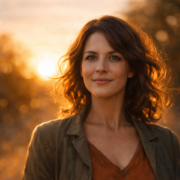 A confident woman standing in golden hour light, ultra-realistic portrait photography, soft natural shadows, high detail, professional editorial style.
